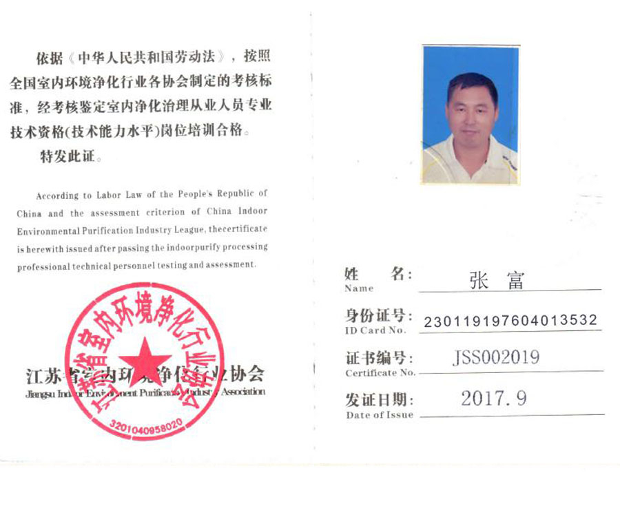室內(nèi)凈化治理從業(yè)人員專(zhuān)業(yè)技術(shù)資格證